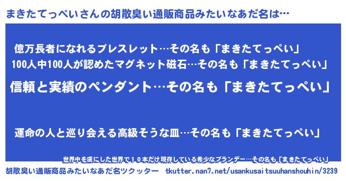 | 男性向けラノベタイトル風あだ名 | 『ダンジョンにまきたてっぺいを求めるのは間違っているだろうか』 |