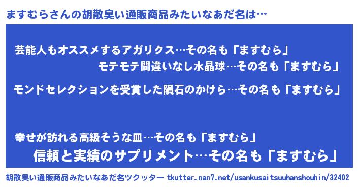 | ヒーロー風カッコイイあだ名 | 『慈愛の使者ますむら』『魔戒騎士マス』 |