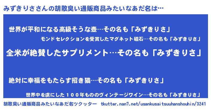 | ヘコむあだ名 | 『みずを』『豆乳』『みずきりさ(笑)』 |