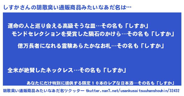| 欧米人風あだ名 | 『マイケルしすか』『アンジェラ・しすか』 |