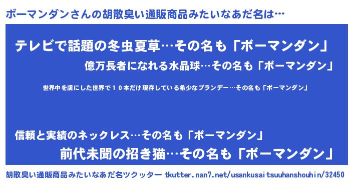 | 意味不明あだ名 | 『住所不定無職ボーマンダン(81歳)』 |