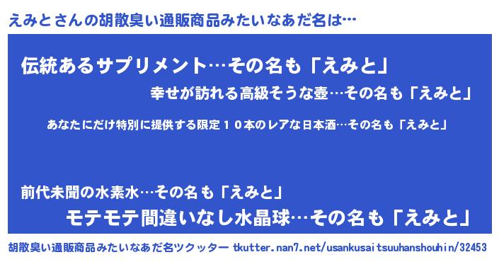 | 意味不明あだ名 | 『住所不定無職えみと(53歳)』 |