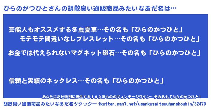 | 男性向けラノベタイトル風あだ名 | 『ノーゲーム・ノーヒラノカツヒト』 |