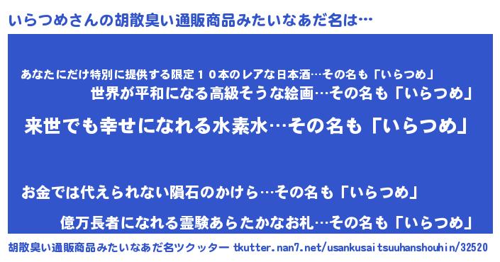 | 男性向けラノベタイトル風あだ名 | 『いらつめという概念が存在しない退屈な世界 』 |