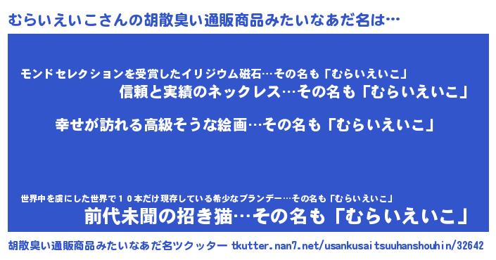 | 男性向けラノベタイトル風あだ名 | 『やはりむらいえいこの青春ラブコメはまちがっている 』 |