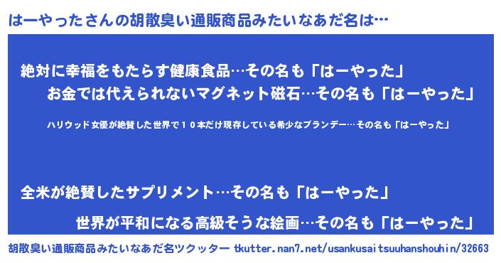 | 意味不明あだ名 | 『住所不定無職はーやった(79歳)』 |