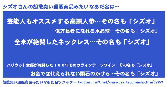 | ヘコむあだ名 | 『シズっぺ』『シズにー』『なまこ酢』 |
