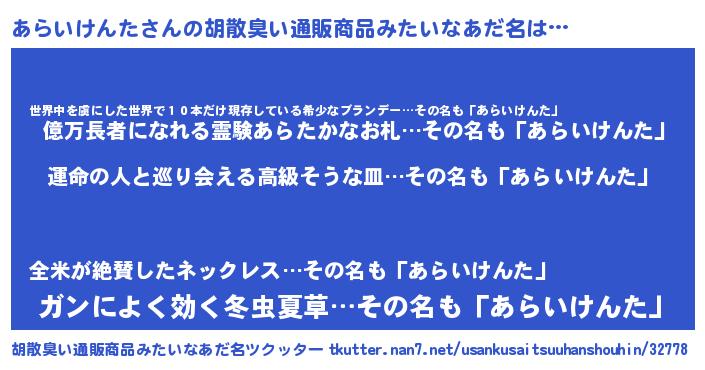 | 男性向けラノベタイトル風あだ名 | 『あらいけんたに滅ぼされるだけの簡単なお仕事です』 |