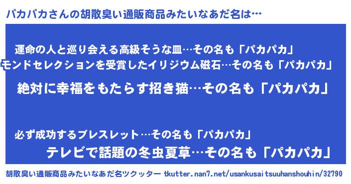| 男性向けラノベタイトル風あだ名 | 『パカパカという概念が存在しない退屈な世界 』 |