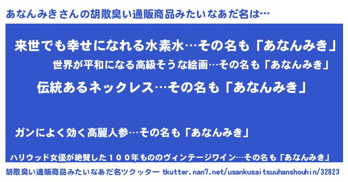 | 男性向けラノベタイトル風あだ名 | 『転生したらあなんみきだった件』 |