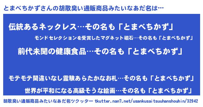 | 男性向けラノベタイトル風あだ名 | 『うちのとまべちかずが世界を掌握している!』 |