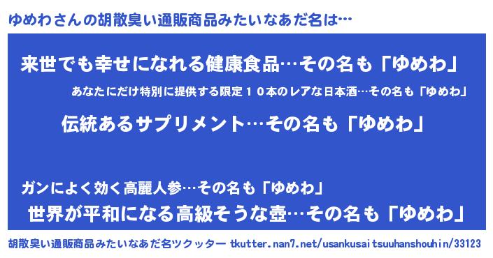 | 男性向けラノベタイトル風あだ名 | 『ゆめわに滅ぼされるだけの簡単なお仕事です』 |