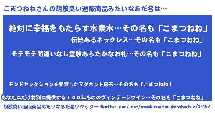| ヘコむあだ名 | 『こまもー』『こまつねね(小並感)』 |
