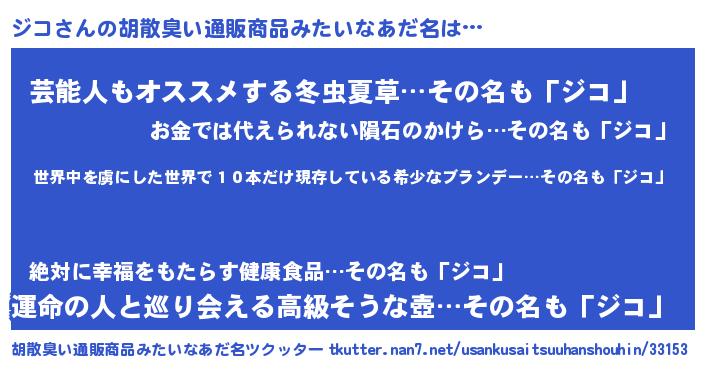 | ヘコむあだ名 | 『豆乳』『ジコ(震え声)』『ジコ太郎』 |