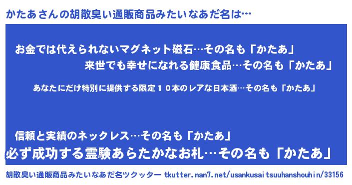 | 男性向けラノベタイトル風あだ名 | 『かたあに滅ぼされるだけの簡単なお仕事です』 |