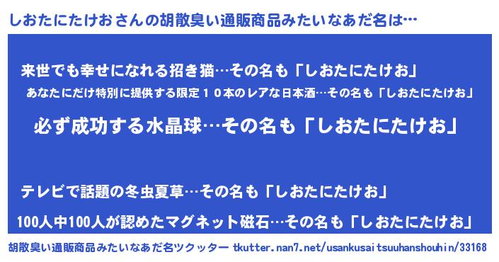 | 男性向けラノベタイトル風あだ名 | 『しおたにたけおの憂鬱』 |