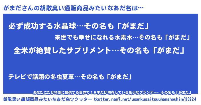 | 男性向けラノベタイトル風あだ名 | 『がまだの嫁は女の子じゃないと思った?』 |