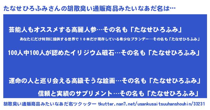 | 男性向けラノベタイトル風あだ名 | 『おまえをオタクにしてやるから、俺をたなせひろふみにしてくれ! 』 |