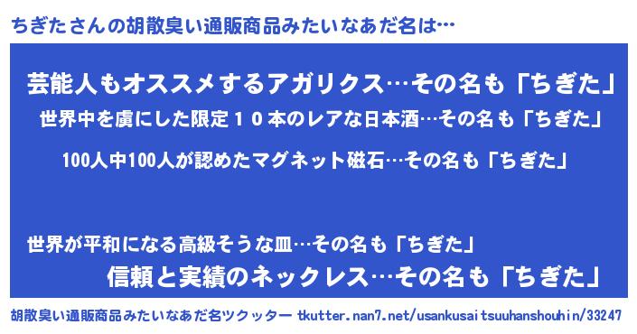 | 意味不明あだ名 | 『眠気覚ましガムちぎた味』『自称ちぎた』 |