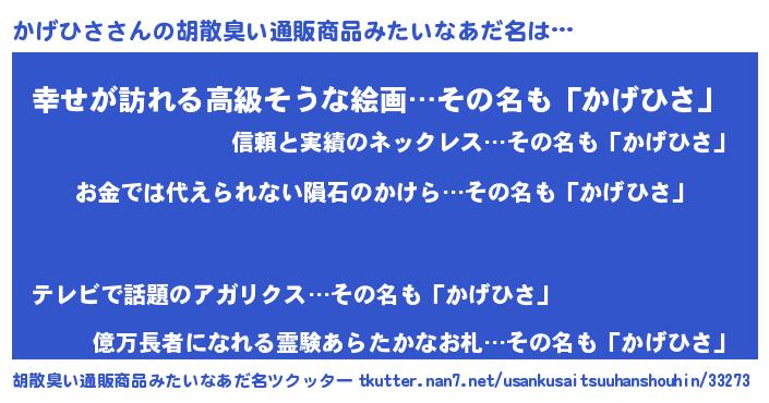 | 男性向けラノベタイトル風あだ名 | 『おまえをオタクにしてやるから、俺をかげひさにしてくれ! 』 |