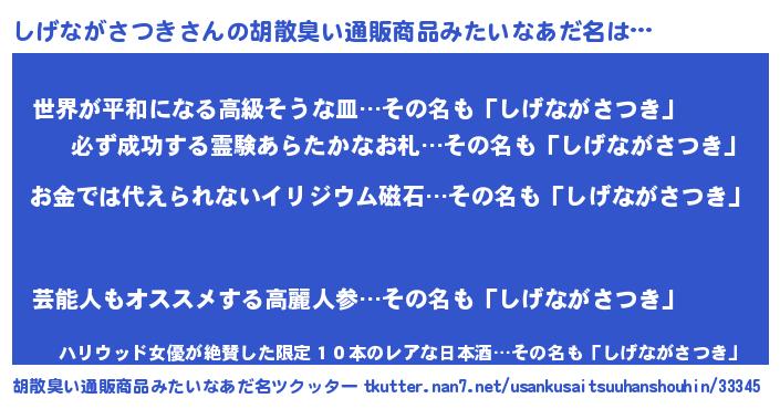 | ヘコむあだ名 | 『なまこ酢』『しげもー』『しげっ子』 |