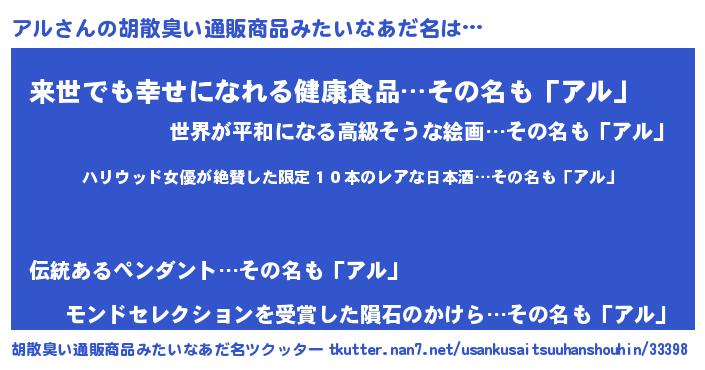 | 男性向けラノベタイトル風あだ名 | 『魔弾の王とアル』『はたらくアルさま!』 |