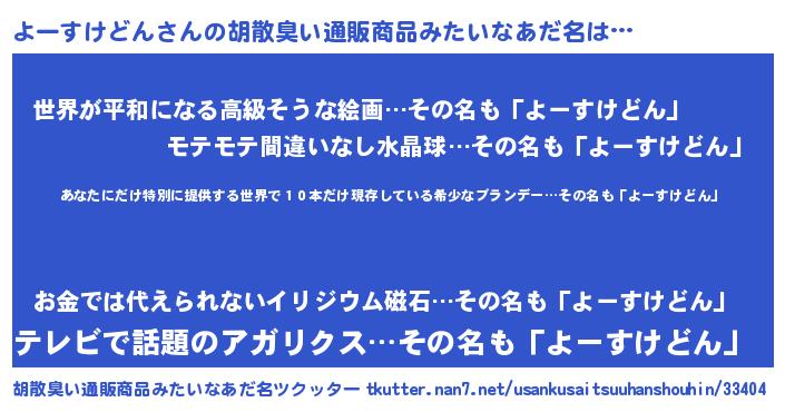 | 男性向けラノベタイトル風あだ名 | 『この素晴らしい世界によーすけどんを!』 |