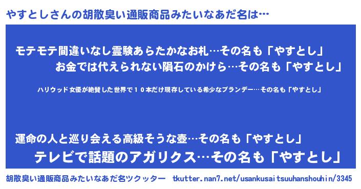 | 意味不明あだ名 | 『住所不定無職やすとし(74歳)』 |