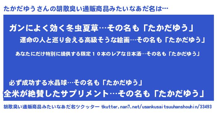 | 男性向けラノベタイトル風あだ名 | 『この素晴らしい世界にたかだゆうを!』 |