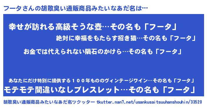 | 男性向けラノベタイトル風あだ名 | 『おまえをオタクにしてやるから、俺をフータにしてくれ! 』 |
