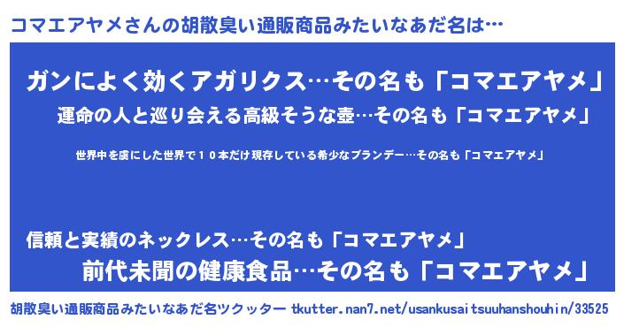 | 恥ずかしいあだ名 | 『コマエアヤメデラックス』『コマちん』 |