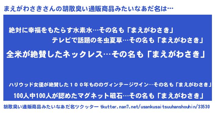| 男性向けラノベタイトル風あだ名 | 『まえがわさきの嫁は女の子じゃないと思った?』 |