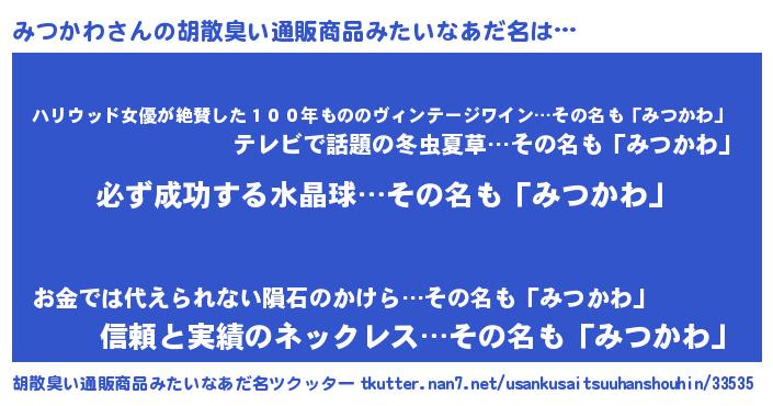 | 男性向けラノベタイトル風あだ名 | 『みつかわの憂鬱』『魔弾の王とみつかわ』 |
