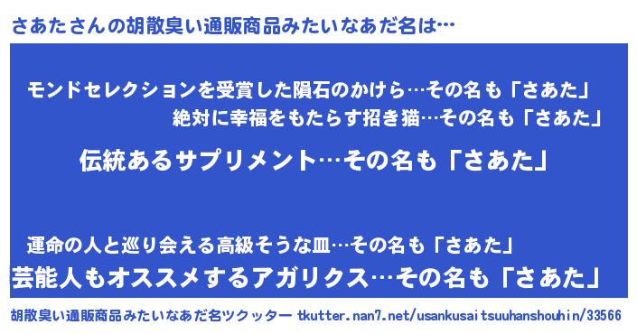 | 女子向けラノベタイトル風あだ名 | 『さあたの卵を拾いまして』『闇のさあた』 |