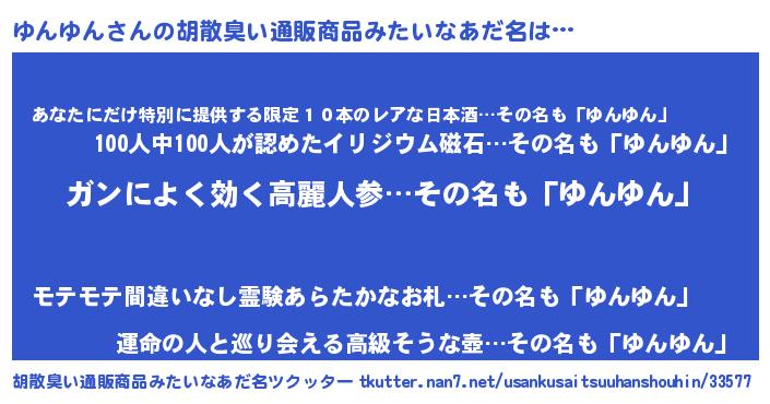 | 意味不明あだ名 | 『自称ゆんゆん』『ヨモギ科ゆんゆん属』 |