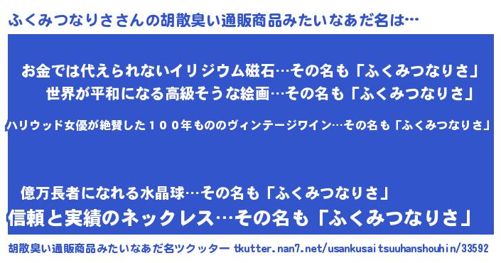 | 意味不明あだ名 | 『住所不定無職ふくみつなりさ(1歳)』 |