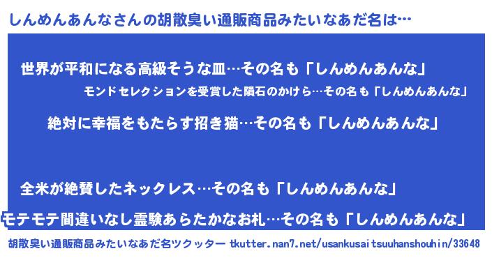 | 男性向けラノベタイトル風あだ名 | 『シンメンアンナスレイヤー』 |