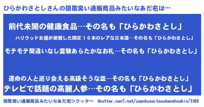 | ヘコむあだ名 | 『ひらっふぃ~』『ひらかわさとし(爆)』 |
