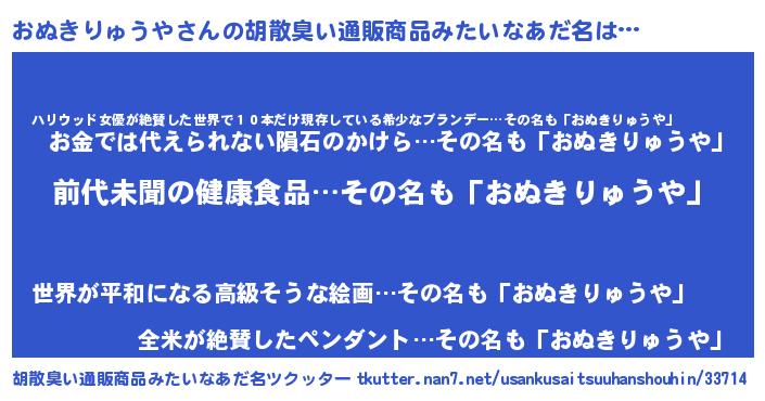 | 意味不明あだ名 | 『永久保存おぬきりゅうや』 |