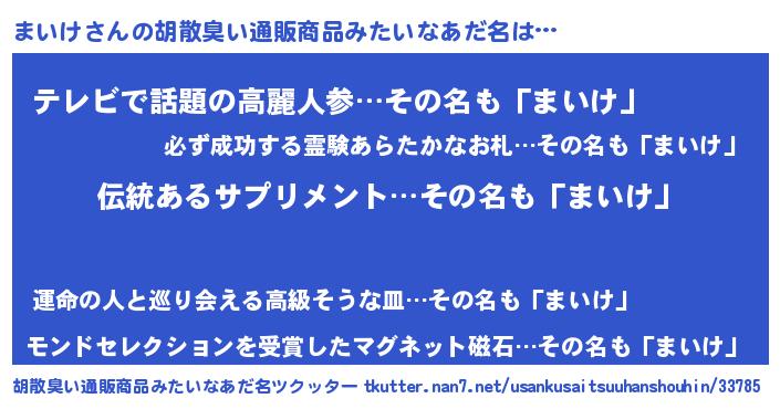 | 意味不明あだ名 | 『とにかく怪しいまいけ』『自称まいけ』 |