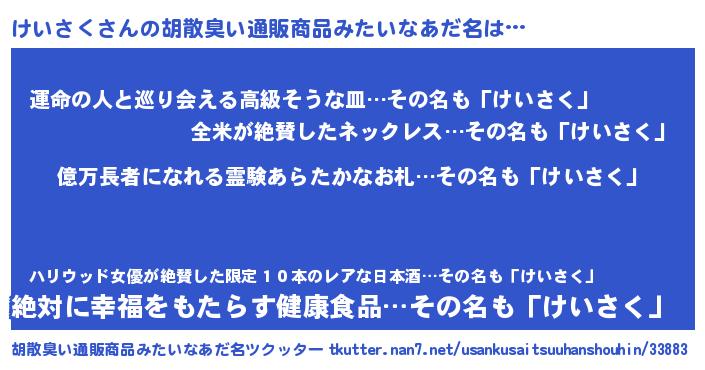 | 男性向けラノベタイトル風あだ名 | 『けいさく~年齢イコール彼女いない歴の魔法使い~』 |