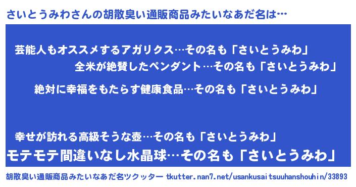 | 女子向けラノベタイトル風あだ名 | 『異世界で失敗しない100のさいとうみわ』 |