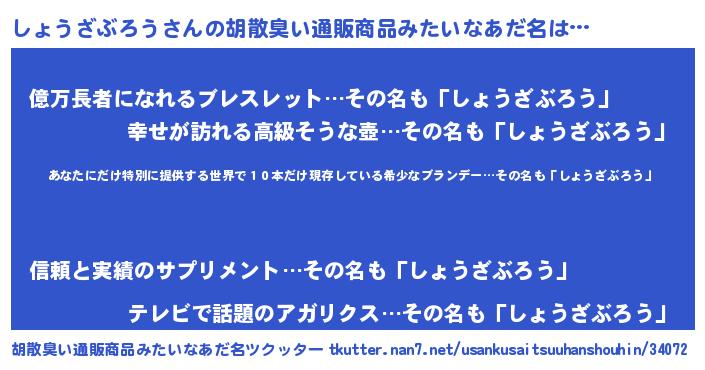 | 男性向けラノベタイトル風あだ名 | 『この素晴らしい世界にしょうざぶろうを!』 |