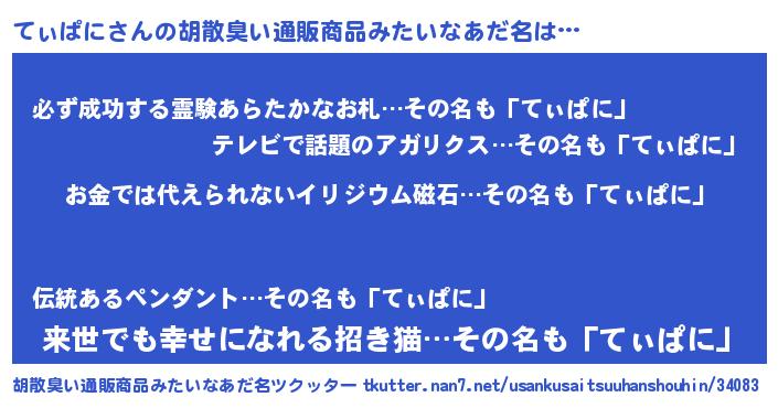 | 男性向けラノベタイトル風あだ名 | 『転生したらてぃぱにだった件』 |
