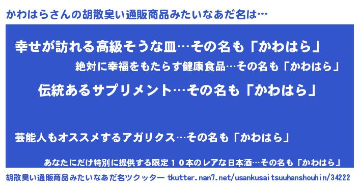 | 意味不明あだ名 | 『とにかく怪しいかわはら』 |