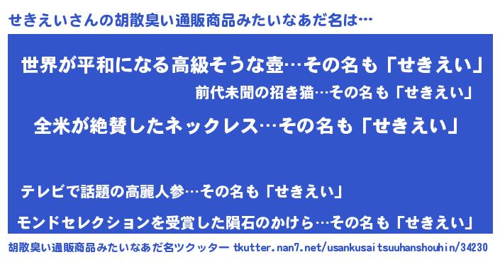 | 男性向けラノベタイトル風あだ名 | 『せきえい~年齢イコール彼女いない歴の魔法使い~』 |