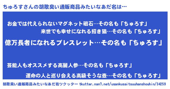 | 男性向けラノベタイトル風あだ名 | 『ちゅろす~年齢イコール彼女いない歴の魔法使い~』 |