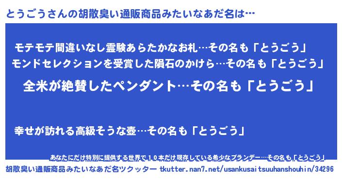 | 意味不明あだ名 | 『とにかく怪しいとうごう』 |