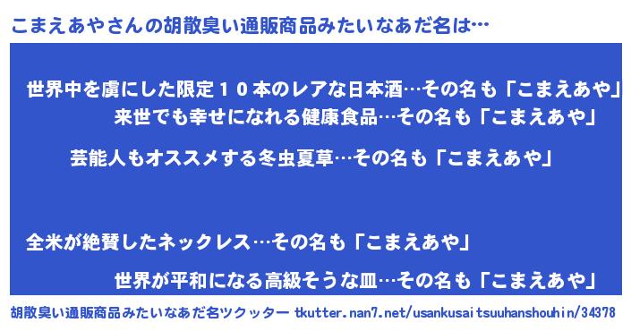 | 意味不明あだ名 | 『自称こまえあや』『永久保存こまえあや』 |