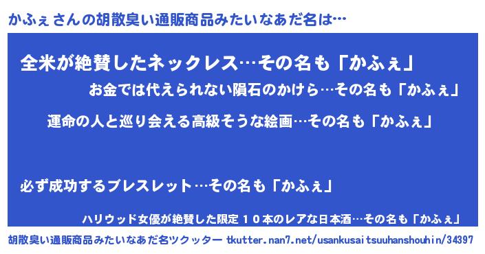 | ヘコむあだ名 | 『酢こんぶ』『かふを』『かふもー』 |
